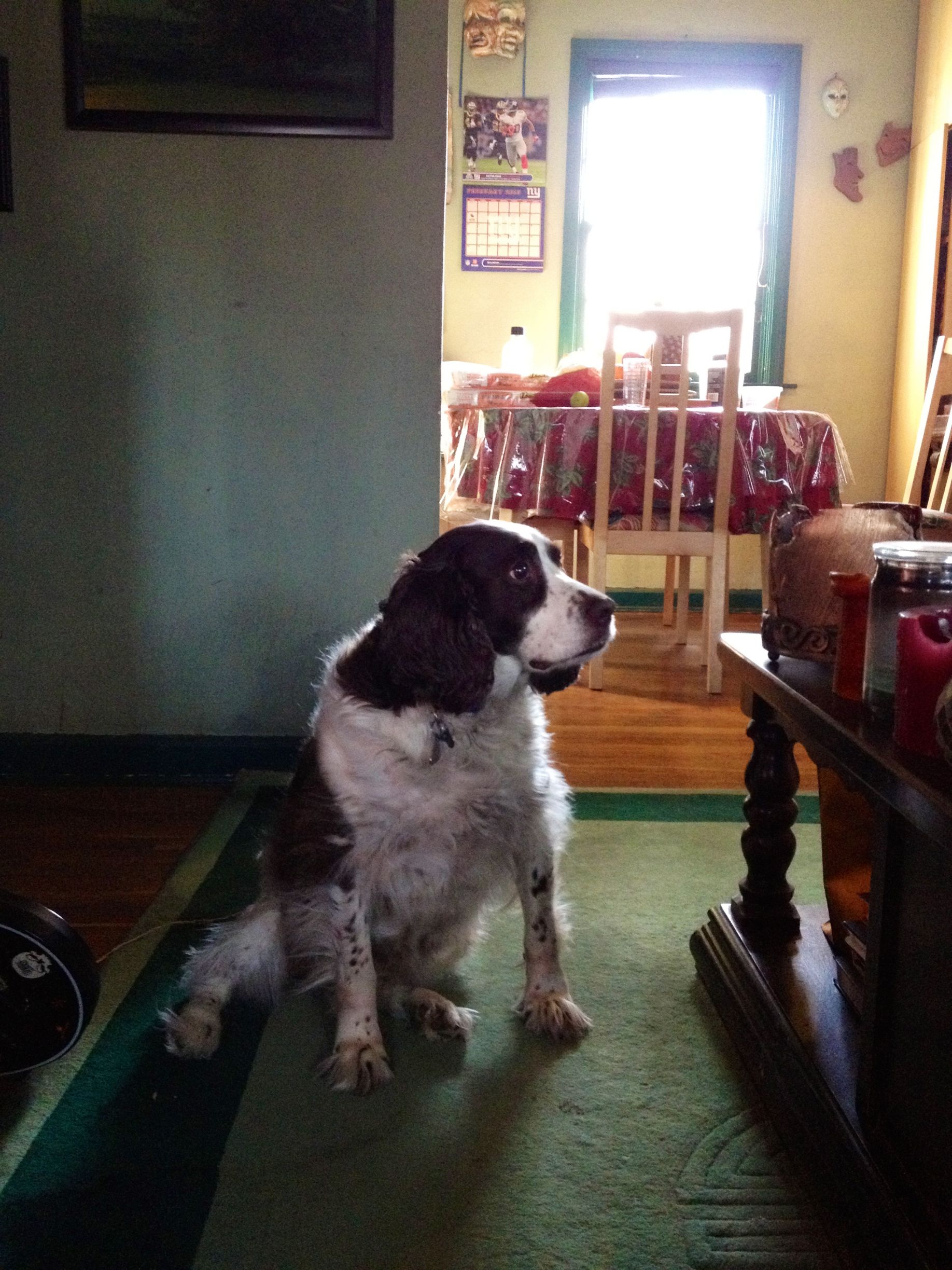 Sparky has no shame about begging. He lays his chin on your knee and stares at you with his doleful brown eyes, without blinking. He’s also smart enough to know who’s the easiest target in the room.